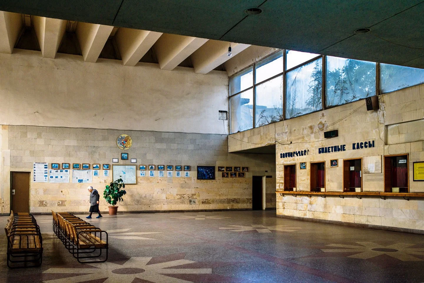 An elderly Armenian woman walks slowly and alone through this grand and empty Soviet-era bus station―an eerily emblematic scene of modern-day Armenia.